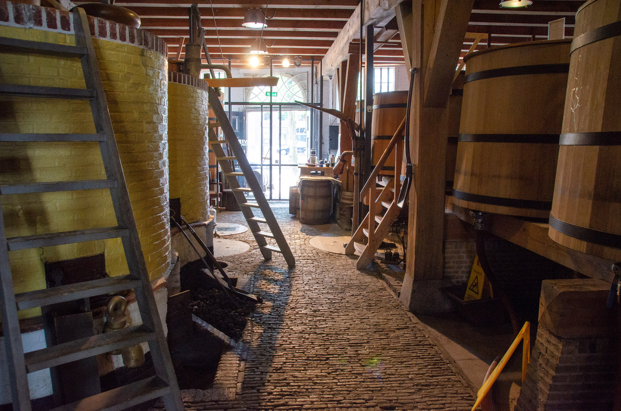 In de historische branderij staan enorme koperen ketels. Hier wordt de Old Schiedam jenever tot op de dag van vandaag gemaakt. De stokers vertellen graag over hoe dit allemaal in zijn werk gaat.